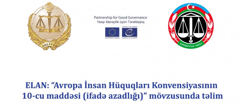 Avropa Şurası və Avropa İttifaqının birgə həyata keçirdiyi “Yaxşı idarəçilik üçün tərəfdaşlıq” proqramı çərçivəsində “Avropa İnsan Hüquqları Konvensiyası və Avropa İnsan Hüquqları Məhkəməsinin presedent hüququnun Azərbaycanda tətbiqi” adlı layihənin icrası ilə əlaqədar, Avropa Şurasının Bakıdakı Ofisi, Ədliyyə Akademiyası və Vəkillər Kollegiyası tərəfindən vəkillər üçün “Avropa İnsan Hüquqları Konvensiyasının 10-cu maddəsi (ifadə azadlığı)” mövzusunda təlim təşkil olunacaqdır.